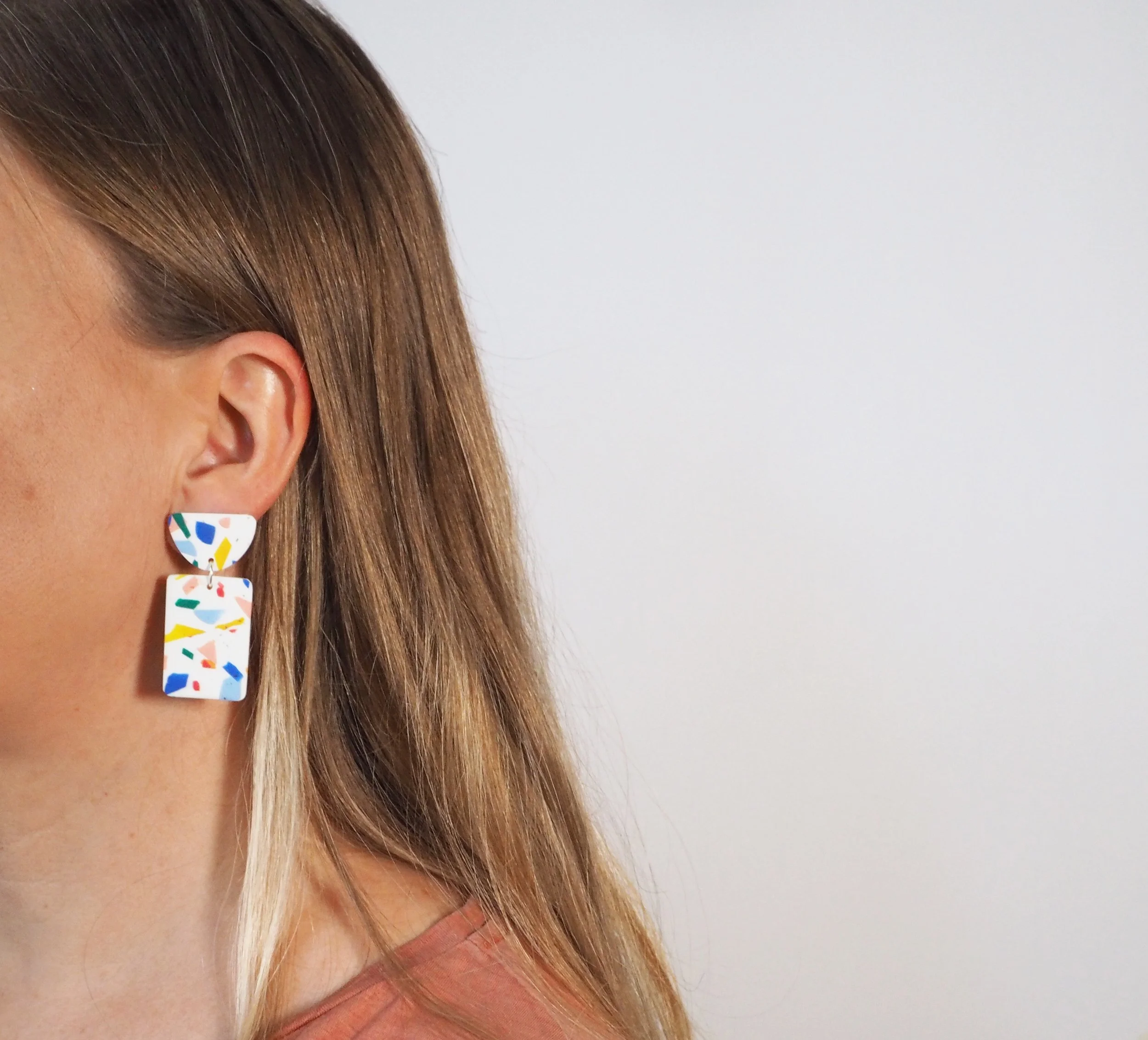 Striking terrazzo design earrings, White base with rainbow colours scattered over the surface. The stud is semi circle, Hanging to rectangle shape polymer clay earrings all fastened with silver plated jump rings. Patterns are rolled in during the making process, the terrazzo markings on these earrings stand in relief of the background. The handmade process means that each earring is different from its partner but compliments it and can be worn as a pair. The material is very light and hard wearing, you will forget they are in your ears! All hello terry earrings have nickle free silver plated earring stalks and a silver plated push on back.